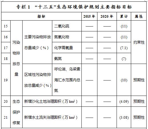 ——污染物排放總量控制目標(biāo)。到2020年,全區(qū)化學(xué)需氧量、氨氮、二氧化硫和氮氧化物排放總量分別控制在77.66萬噸、4.37萬噸、109.56萬噸和101.37萬噸以內(nèi),比2015年的83.56萬噸、4.69萬噸、123.09萬噸和113.88萬噸分別減少7.1%、7%、11%和11%。呼倫湖、烏梁素海匯水范圍內(nèi)總氮減少10%。