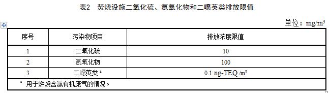 4.2.2廢氣焚燒設(shè)施應對排放煙氣中的二氧化硫、氮氧化物和二噁英類進行監(jiān)測,并達到表2規(guī)定的要求。其他大氣污染物排放還應滿足表1的控制要求。