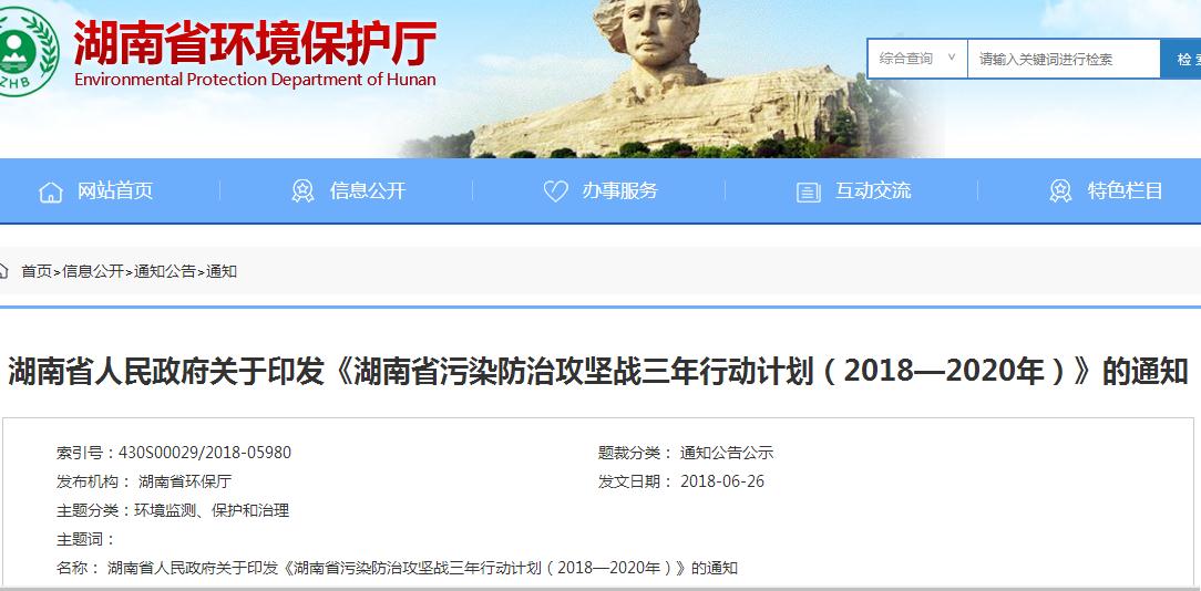 6月26日湖南省環(huán)保廳發(fā)布湖南省人民政府關(guān)于印發(fā)《湖南省污染防治攻堅戰(zhàn)三年行動計劃(2018—2020年)》的通知,內(nèi)容如下: