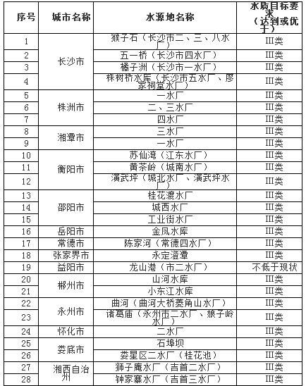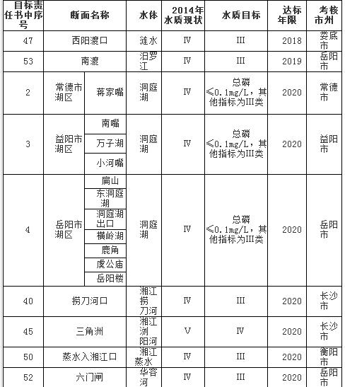 其中:洞庭湖水環(huán)境質(zhì)量大幅改善,到2020年,除總磷≤0.1mg/L外,洞庭湖湖體其他指標(biāo)達(dá)到Ⅲ類水質(zhì)要求。益陽皇家湖、后江湖、三仙湖,岳陽南湖、芭蕉湖、東風(fēng)湖,常德珊珀湖等內(nèi)湖水質(zhì)達(dá)到水環(huán)境功能區(qū)目標(biāo)要求;湘江漣水西陽渡口、汨羅江南渡等斷面水質(zhì)達(dá)到年度考核目標(biāo)要求;地級城市集中式飲用水水源水質(zhì)達(dá)到或優(yōu)于Ⅲ類比例高于 96.4%;地下水考核點位水質(zhì)保持穩(wěn)定。