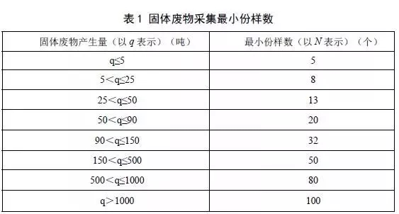 b)間歇產(chǎn)生固體廢物時,如固體廢物產(chǎn)生的時間間隔小于一個月,應以確定的工藝環(huán)節(jié)一個月內(nèi)的固體廢物最大產(chǎn)生量為依據(jù),按照表1確定需要采集的最小份樣數(shù)。如固體廢物產(chǎn)生的時間間隔大于一個月,以每次產(chǎn)生的固體廢物總量為依據(jù),按照表1確定需要采集的份樣數(shù)。
