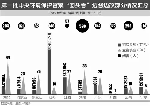截至6月25日晚八時(shí),6個(gè)督察組共收到群眾舉報(bào)29245件,受理有效舉報(bào)24246件,經(jīng)梳理合并重復(fù)舉報(bào),累計(jì)向被督察地方轉(zhuǎn)辦交辦23087件。從數(shù)量上看,河南、河北的交辦數(shù)量最多,都超過(guò)了3000件。各被督察地方完成查處12409件,其中立案處罰2579家,罰款25096萬(wàn)元;立案?jìng)刹?08件,拘留235人;約談1065人,問(wèn)責(zé)1939人。