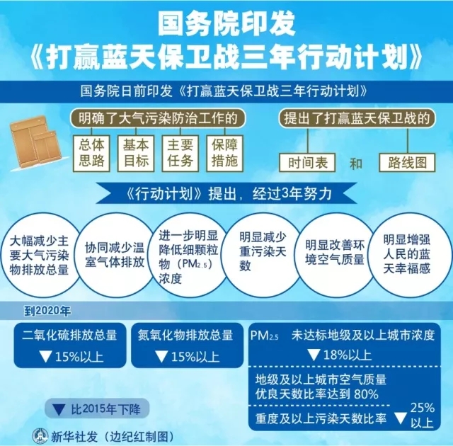 經(jīng)李克強(qiáng)總理簽批,國務(wù)院日前印發(fā)《打贏藍(lán)天保衛(wèi)戰(zhàn)三年行動計劃》(以下簡稱《行動計劃》),明確了大氣污染防治工作的總體思路、基本目標(biāo)、主要任務(wù)和保障措施,提出了打贏藍(lán)天保衛(wèi)戰(zhàn)的時間表和路線圖。