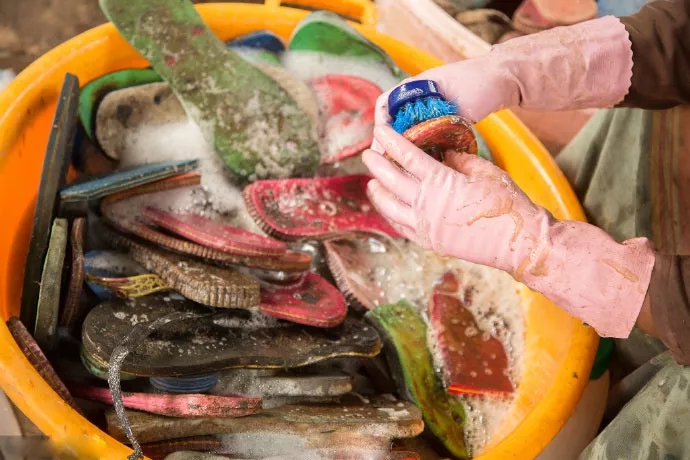 她開始鼓勵(lì)當(dāng)?shù)氐膵寢寕兓厥諒U舊拖鞋