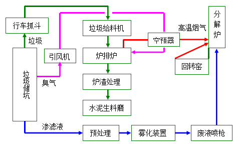 垃圾在儲(chǔ)存過(guò)程中生成的滲濾液為高濃度有機(jī)污水,經(jīng)過(guò)濾處理后,噴射至分解爐內(nèi)高溫蒸發(fā)氧化處理,完全分解有機(jī)成分,實(shí)現(xiàn)無(wú)害化。