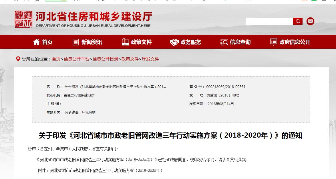 關(guān)于印發(fā)《河北省城市市政老舊管網(wǎng)改造三年行動(dòng)實(shí)施方案(2018-2020年)》的通知