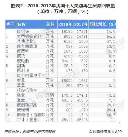 截至2017年底,我國廢鋼鐵、廢有色金屬、廢塑料、廢輪胎、廢紙、廢棄電器電子產(chǎn)品、報(bào)廢機(jī)動(dòng)車、廢舊紡織品、廢玻璃、廢電池十大類別的再生資源回收總量為2.82億噸,同比增長11%。其中,廢電池、廢玻璃、廢舊紡織品回收量增幅較為明顯,分別增長46.7%、24.4%和29.6%;廢塑料和報(bào)廢機(jī)動(dòng)車回收量出現(xiàn)下滑,分別同比減少9.9%和7.7%。