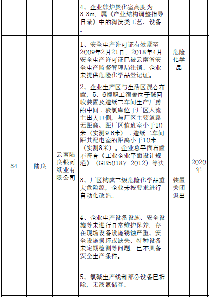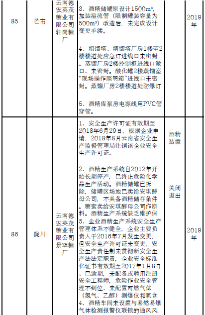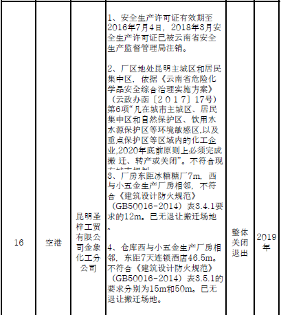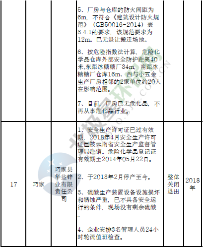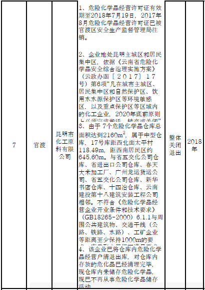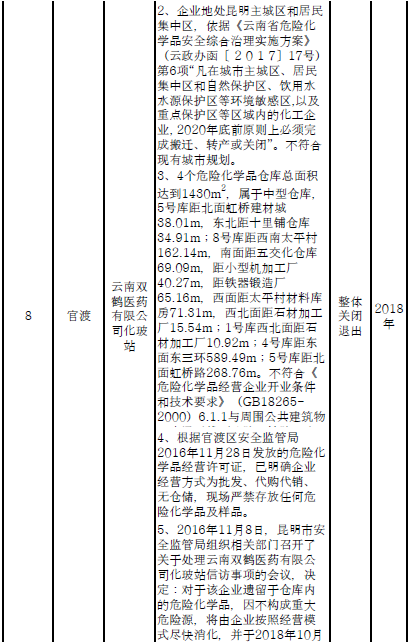 四、對8戶(詳見附件3)位于人員密集區(qū)、安全距離不足、工藝技術(shù)落后、存在重大隱患的危險化學(xué)品生產(chǎn)(儲存)企業(yè)進(jìn)行綜合整治,2020年底前全部完成,各相關(guān)企業(yè)具體完成時間由各州市政府結(jié)合本地實際確定。各州市政府要統(tǒng)籌制定重大隱患綜合整治方案,做到“一企一方案”并報省安委會辦公室。其中:昆明市2戶,曲靖市1戶,玉溪市1戶,楚雄州1戶,文山州1戶,西雙版納州1戶,大理州1戶。