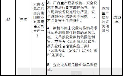 三、對37戶(詳見附件2)內(nèi)部安全距離不足、工藝技術(shù)和裝備水平低的危險化學(xué)品企業(yè)實施就地改造。其中:昆明市9戶,曲靖市5戶,玉溪市2戶,保山市1戶,楚雄州2戶,普洱市11戶,西雙版納州2戶,大理州1戶,德宏州1戶,怒江州1戶,臨滄市2戶。