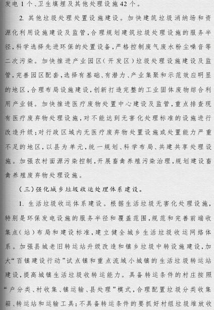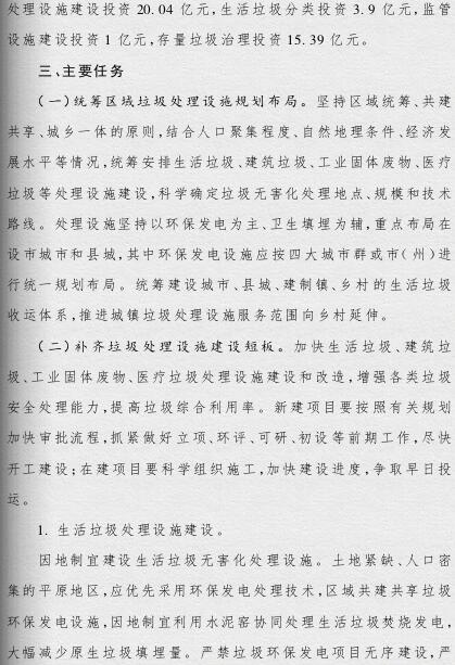 《方案》提出,要根據人口聚集程度、自然地理條件、經濟發(fā)展水平等情況統(tǒng)籌規(guī)劃布局垃圾處理設施建設;要補齊垃圾處理設施建設短板,到2019年底,新建生活垃圾無害化處理設施76座,完成無害化處理設施改擴建43個和存量垃圾治理項目62個。