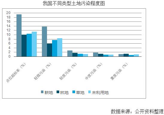 從土地類型來看,耕地的點位超標(biāo)率最高,達到了19.4%,而其他三種土地的超標(biāo)率略高于10%的水平。耕地直接涉及到我國的食品安全問題,這也是近年來土地污染問題越來越受到群眾關(guān)心的重要原因。