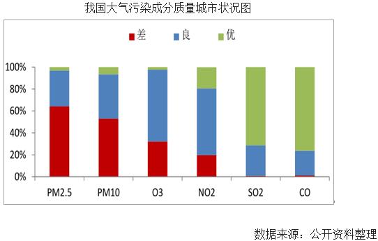 我國大氣污染源主要集中于工業(yè)污染和汽車尾氣,根據(jù)環(huán)境部發(fā)布的《2017年中國環(huán)境狀況公報》,我國338個城市中大氣的主要污染物集中在PM2.5、PM10、臭氧和氮氧化物。其中較為嚴重的是PM2.5和PM10。在統(tǒng)計的338個城市里,這兩項指標(biāo)差的城市比例高達50%以上。改善空氣質(zhì)量要從上述4種物質(zhì)的排放源下手。