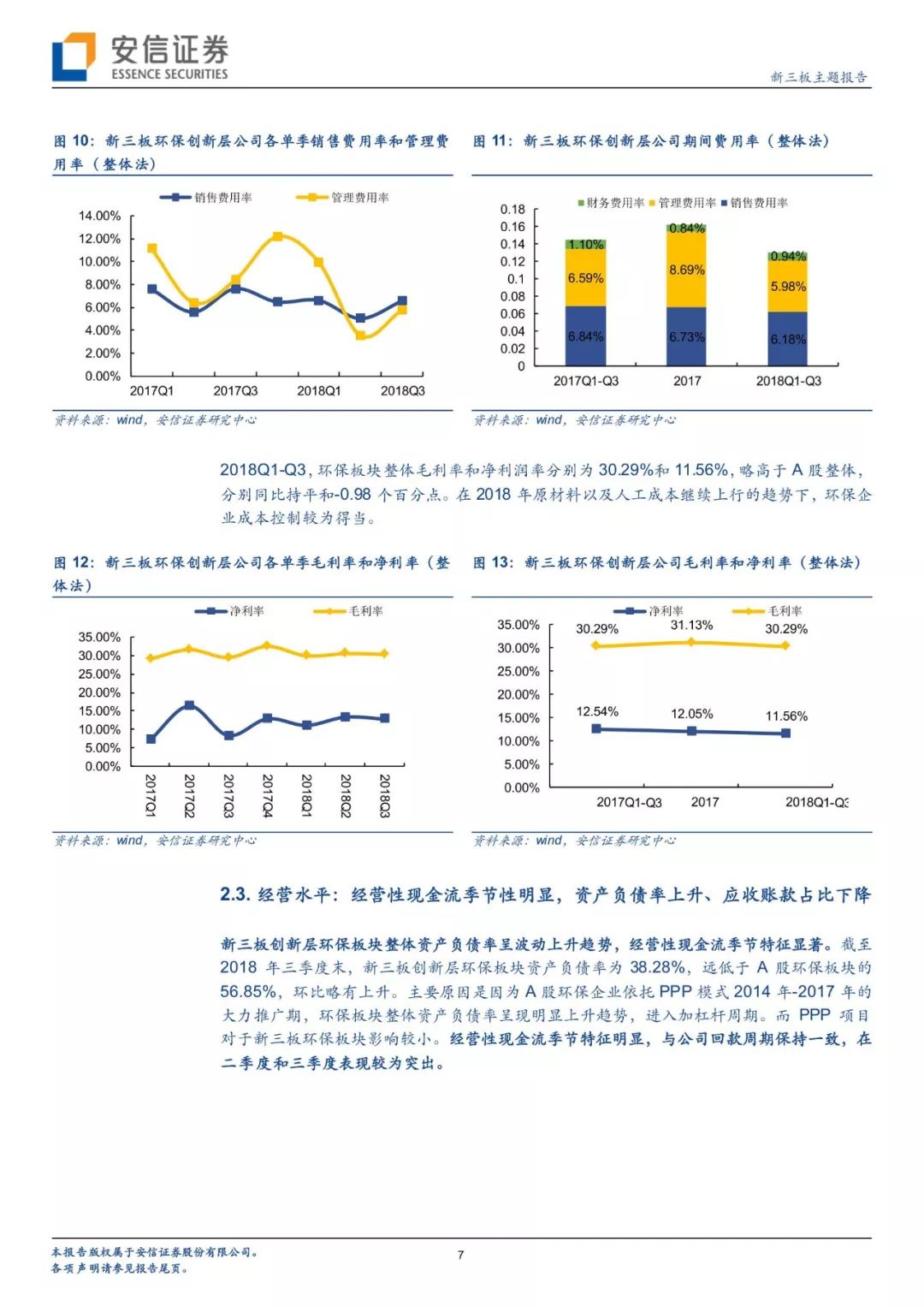 經(jīng)營水平:截至2018年三季度末,新三板創(chuàng)新層環(huán)保板塊資產(chǎn)負債率為38.28%,遠低于A股環(huán)保板塊的56.85%,主要原因是A股環(huán)保企業(yè)依托PPP模式,且2014年-2017年的大力推廣期,資產(chǎn)負債率呈現(xiàn)明顯上升,進入加杠桿周期,而PPP項目對于新三板環(huán)保板塊影響較小。經(jīng)營性現(xiàn)金流與回款周期保持一致,季節(jié)性特征顯著。2018Q3經(jīng)營性活動現(xiàn)金流凈額/營業(yè)收入比例為4.93%,同比下降1.48pct。環(huán)保企業(yè)三季度回款要優(yōu)于二季度,這與工程項目結算和政府撥款進度有關。截至三季度末,新三板環(huán)保板塊應收賬款/總資產(chǎn)比重為24.31%,遠高于A股的12.38%,主要與新三板環(huán)保企業(yè)議價能力有關。