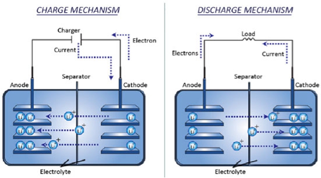 注:Charge mechanism -充電機(jī)理;discharge mechanism -放電機(jī)理;charger -充電器;load -負(fù)載;electrons -電子;current -電流;electrolyte -電解質(zhì);anode -陽(yáng)極(電池放電時(shí)為負(fù)極);cathode -陰極(電池放電時(shí)為正極);separator -隔膜