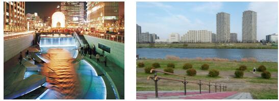請注意概念中的“有限度”和“輔助”兩詞,在水生態(tài)修復(fù)中起決定作用的仍應(yīng)為自然修復(fù),工程僅為輔助河(湖)自我修復(fù)過程。圖1中左圖為清溪川城市段,其之所以在治理后得到很多人贊許,并非因?yàn)槠渖鷳B(tài)性,而因其景觀優(yōu)美,景雖美卻無處不流漏出人工斧鑿的痕跡,圖1右圖為多摩川城市段,其雖不如清溪川華麗卻有著“清水出芙蓉,天然去雕飾。”的渾然天成的美感。