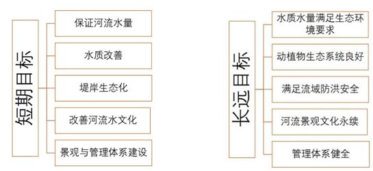 短期目標(biāo),一般以某條河流目前需要解決的主要面臨的問題為主要目標(biāo),但必須與長遠(yuǎn)目標(biāo)相銜接,兩者統(tǒng)籌考慮,分段實(shí)施,短期目標(biāo)內(nèi)容因依不同城市河流及其存在的主要問題來設(shè)置。