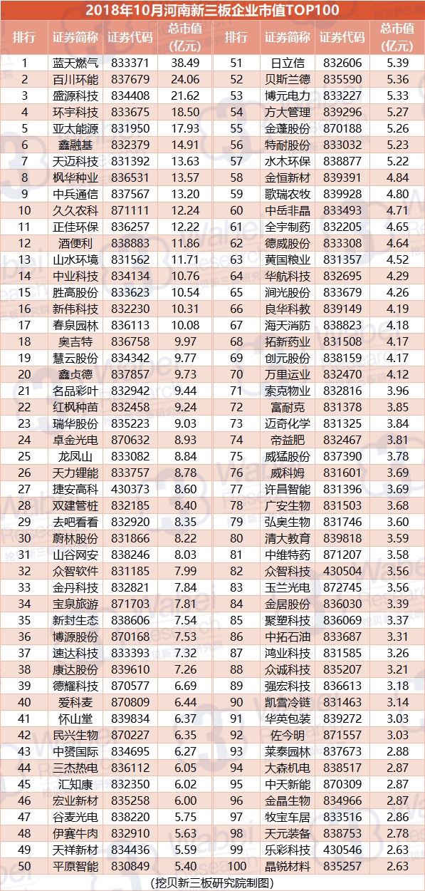 附:2018年10月河南新三板企業(yè)市值TOP100