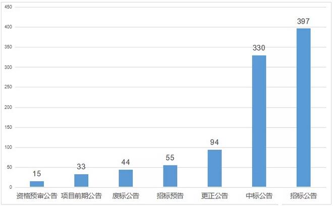 11月上旬(11月1日-10日)全國各地共發(fā)布環(huán)衛(wèi)運(yùn)營類項(xiàng)目公開招標(biāo)采購信息968個(gè),其中:項(xiàng)目前期公告33個(gè),招標(biāo)預(yù)告55個(gè),招標(biāo)公告397個(gè),資格預(yù)審公告15個(gè),更正公告94個(gè),中標(biāo)公告330個(gè),廢標(biāo)及流標(biāo)公告44個(gè)。