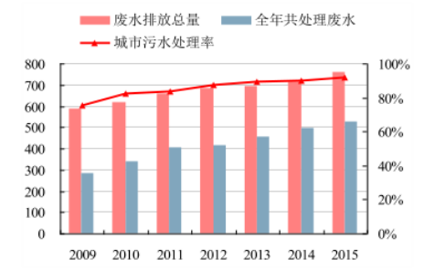 2015 年我國(guó)污水排放總量達(dá) 759.2 億噸,較 2014 年同比增長(zhǎng) 6%,2015 全年共處理污水 527.7 億噸,同比增長(zhǎng) 6.8%,處理廢水量與廢水排放總量的差距不斷縮小,廢水處理能力不斷上升。2015 年我國(guó)城市污水 561.3億噸,處理率已經(jīng)到達(dá) 91.8%,根據(jù)《“十三五”全國(guó)城鎮(zhèn)污水處理及再生利用設(shè)施建設(shè)規(guī)劃》的要求,到 2020 年,城市污水處理率要達(dá)到 95%,仍有一定的發(fā)展空間。