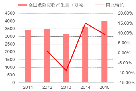 隨著我國(guó)經(jīng)濟(jì)的發(fā)展與工業(yè)化水平的提高,全國(guó)危廢的產(chǎn)生量呈現(xiàn)出迅速增加的態(tài)勢(shì)。根據(jù)數(shù)據(jù),近年來(lái),全國(guó)危廢綜合利用處置率保持在 80%左右。2015 年危廢產(chǎn)生量 3976 萬(wàn)噸,綜合利用量 2050萬(wàn)噸,處置量 1174 萬(wàn)噸,綜合利用處置率為 81.08%。