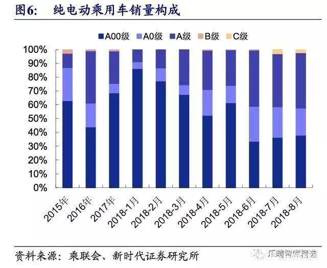 2018 年補(bǔ)貼新政出臺,更加鼓勵(lì)長續(xù)航里程乘用車,受過渡期后補(bǔ)貼大幅減少甚至取消的影響,短續(xù)航里程 A00級車型在 6 月 12 日前出現(xiàn)搶裝行情,過渡期結(jié)束后銷量占比逐步減少。
