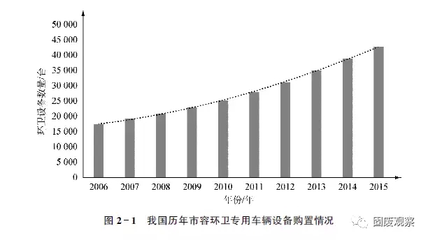 據國家統(tǒng)計局統(tǒng)計,截至2015年年底,我國城鎮(zhèn)化率已經達到56.1%。且目前正以年均1個百分點的速度增長。2015年,全國市容環(huán)衛(wèi)專用車輛設備共42702臺,同比增加3789臺,如圖2-1所示。