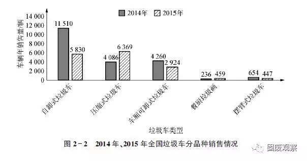 2015年我國垃圾車共完成銷售16386輛,同比下降24.03%。細分品種, 2015年壓縮式垃圾車累計銷量超過6300輛,同比增長55%以上,占2015年全國垃圾車總銷量超過38%,同比提升19%;自卸式垃圾車大幅下降,幅度超過49%,市場份額的下降超過17%;餐廚垃圾車實現快速增長,銷售459輛,同比增長194.23%,市場份額2.80%,同比提升2.08%;擺臂式垃圾車447輛,同比降低31.65%,市場份額2.73%。