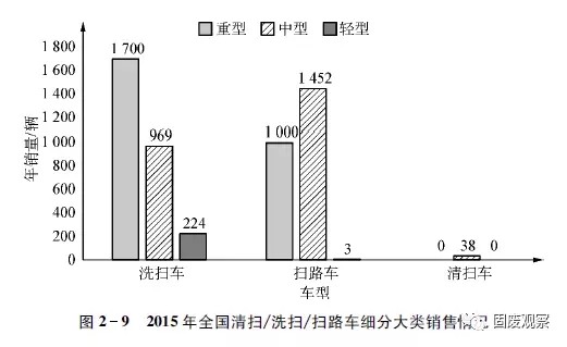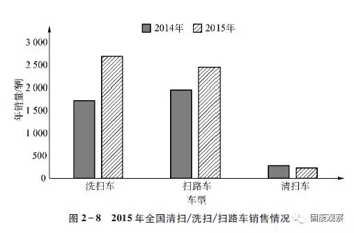2015年,我國合計完成清掃車、洗掃車、掃路車銷售5386輛,同比增長36.01%。細分市場,洗掃車和掃路車累計銷量同比均實現增長,分別達到2700輛和2459輛,同比增幅分別在56%和25%以上,在2015年全國清掃/洗掃/掃路車總銷量中的占有率分別在50%和45%以上,同比分別增長6%和下降3%以上。