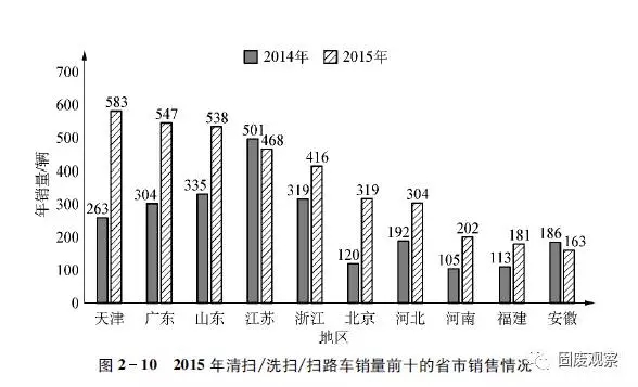 2015年,我國清掃車、洗掃車、掃路車銷售排名前十的區(qū)域有天津、廣東、山東、江蘇、浙江、北京、河北、河南、福建、安徽等,除江蘇和安徽2省之外,同比均實現增長,且幅度均在30%以上。