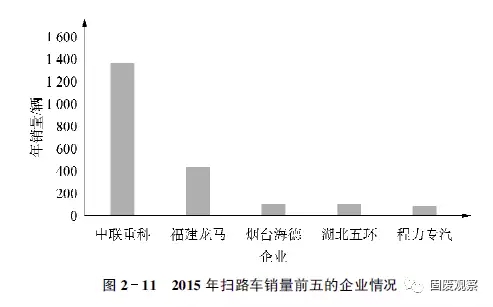 2015年全國銷售掃路車的前5企業(yè)合計銷售掃路車2094輛,在2015年全國掃路車總銷量(下同)中的份額達到85.16%。其中,中聯重科以1362輛的銷量(同比增長在24%以上)和55.39%的占有份額(同比下降0.42 %)高居行業(yè)榜首,該企業(yè)也是2015年全國銷售掃路車企業(yè)中唯一一家掃路車銷量超過1000輛且在1300輛以上的企業(yè),福建龍馬環(huán)衛(wèi)裝備累計銷量在430輛以上,同比增長91.56%,占有份額在17%以上,排名第二(詳見表2-11),其余企業(yè)累計銷量均在110輛以下。