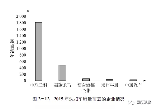 2015年我國洗掃車市場累計銷量前5企業(yè)合計銷售洗掃車2448輛,在2015年全國洗掃車總銷量(下同)中的占有份額合計實現90.67%。其中,中聯重科累計實現銷量1820輛,是2015年全國銷售洗掃車企業(yè)中唯一一家洗掃車累計銷量超過1000輛且在1800輛以上的企業(yè),同比增長在47%以上,占有份額超過67%,同比下降4.10%,高居全國洗掃車行業(yè)榜首;福建龍馬環(huán)衛(wèi)以累計銷量491輛,18%以上的占有份額屈居第二(詳見表2-12),其余企業(yè)累計銷量均在70輛以下。