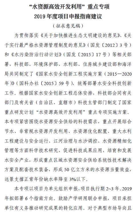 日前,科技部社會發(fā)展科技司發(fā)布了《關(guān)于國家重點研發(fā)計劃“大氣污染成因與控制技術(shù)研究”等6個重點專項2019年度項目申報指南征求意見的通知》,涉及“大氣污染成因與控制技術(shù)研究”、“典型脆弱生態(tài)修復(fù)與保護研究”、“水資源高效開發(fā)利用”等環(huán)保相關(guān)重點專項,詳情如下: