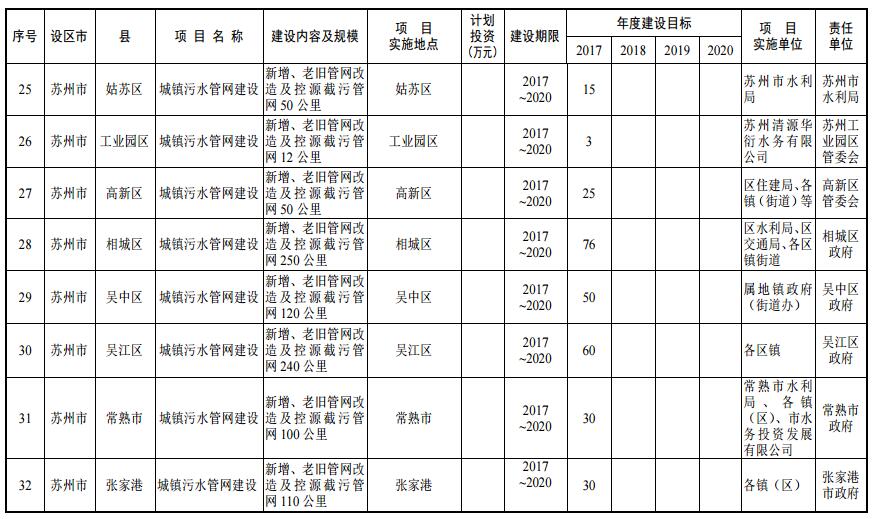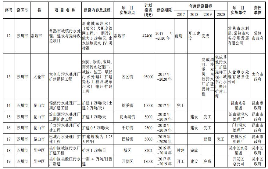 到 2020 年,蘇州市區(qū)、縣級市建成區(qū)生活污水基本實現(xiàn)全收集、全處理;全面推進城鎮(zhèn)污水處理設(shè)施建設(shè),到 2019 年,蘇州市區(qū)、縣級市污水處理率分別達到 95%、85%。到 2020 年,蘇州市區(qū)、縣級市污水處理率分別達到 98%、90%;加強污泥處理處置,2017 年底前,完成現(xiàn)有城鎮(zhèn)污水處理廠污泥處理處置設(shè)施達標改造,設(shè)區(qū)、縣級市建成城鎮(zhèn)污水處理廠污泥綜合利用或永久性處理處置。2020 年底前,縣級市實現(xiàn)永久性污泥處理處置設(shè)施全覆蓋。