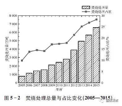 截止到2015年底,我國(含設(shè)市城市與縣城)共建成生活垃圾焚燒設(shè)施257座(其中2015年新建成設(shè)施35座),設(shè)施占比12.4%,總處理能力235224噸/日(其中2015年新建成設(shè)施處理能力34623噸/日),占無害化處理能力的31.0%;年焚燒垃圾6577.0萬噸,占無害化處理總量的28.3%。與2014年相比,在焚燒設(shè)施、焚燒處理能力和焚燒處理量上分別同比增長15.8%、17.3%和15.9%,在設(shè)施數(shù)量占比、設(shè)施能力占比和處理量占比方面分別增加了1.0、2.4和1.5個百分點(diǎn)。2005年度至2015年度焚燒設(shè)施規(guī)模與占比變化見圖5-1和圖5-2所示,與“十一五”期間相比,“十二五”區(qū)間,尤其是2012年以后,焚燒處理能力年增長20%以上。