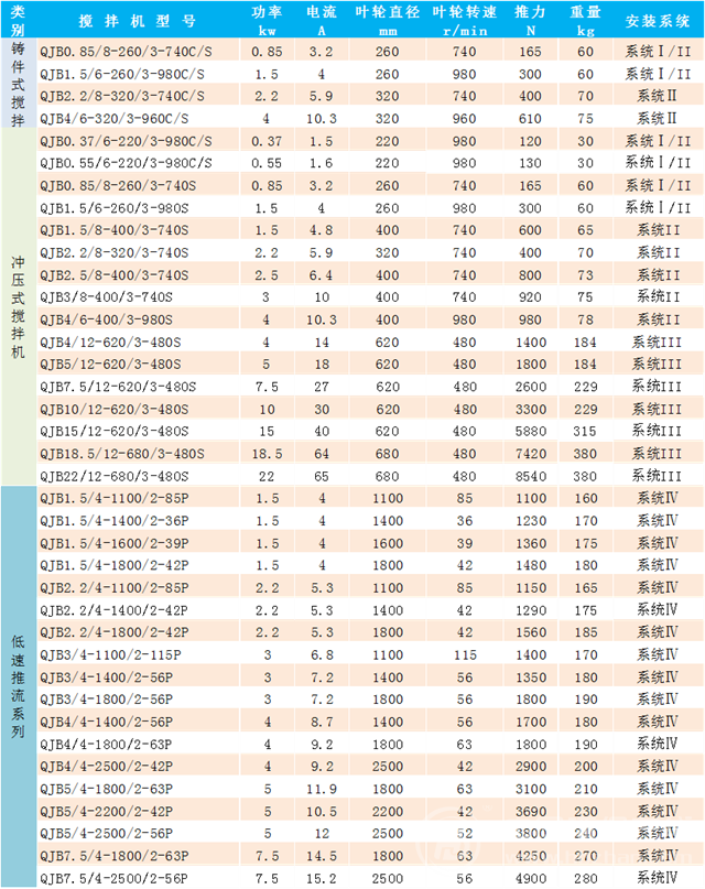 QJB型潛水?dāng)嚢铏C(jī)可分為混合攪拌和低速推流兩大系列。