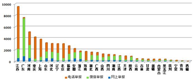 從各地區(qū)舉報(bào)數(shù)量看,電話舉報(bào)量以江蘇省為首,微信舉報(bào)量以廣東省為首,江蘇、廣東、河南、重慶、上海等地總舉報(bào)量相對(duì)較多,五省(市)舉報(bào)量合計(jì)占全國的47.6%。