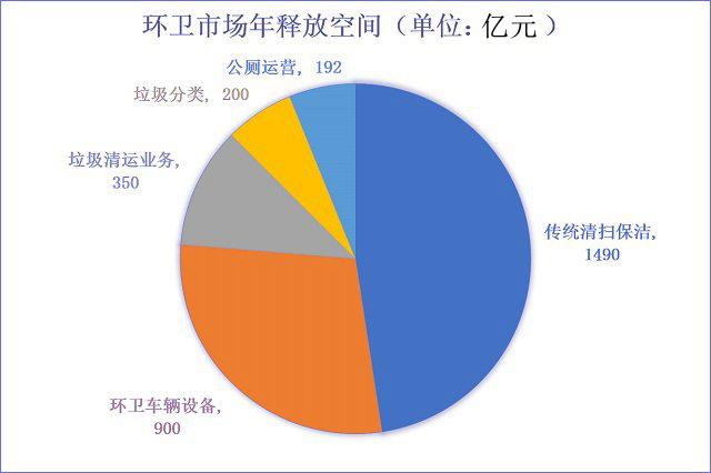 而根據(jù)E20研究院固廢產(chǎn)業(yè)研究中心的預(yù)測,至2020年,環(huán)衛(wèi)行業(yè)整體將釋放3000億元/年的市場空間,其中傳統(tǒng)清掃保潔業(yè)務(wù)約1490億元,環(huán)衛(wèi)車輛設(shè)備900余億元,垃圾清運(yùn)業(yè)務(wù)約350億元,垃圾分類約200億元,公廁運(yùn)營192億元。