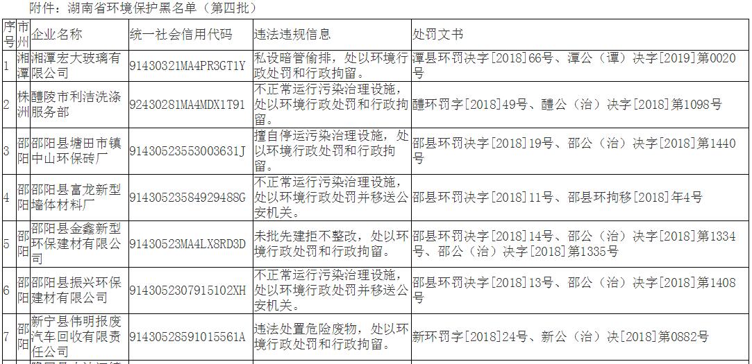 近日,湖南省生態(tài)環(huán)境廳發(fā)布了湖南省環(huán)境保護黑名單(第四批)的通知,全文如下:各市州生態(tài)環(huán)境局:根據(jù)《中華人民共和國環(huán)境保護法》《湖南省人民政府關(guān)于建立完善守信聯(lián)合激勵和失信聯(lián)合懲戒制度加快推進社會誠信建設(shè)的實施意見》《湖南省環(huán)境保護黑名單管理暫行辦法》等相關(guān)規(guī)定,依據(jù)各企業(yè)環(huán)境違法及失信事實,經(jīng)市縣...