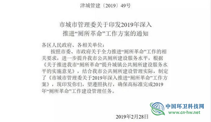 2月28日,天津政務(wù)網(wǎng)發(fā)布《市城市管理委關(guān)于印發(fā)2019年深入推進(jìn)“廁所革命”工作方案的通知》。通知明確:天津全市2019年建成區(qū)內(nèi)新建提升改造公廁200座以上,并且強(qiáng)化公廁管理,推進(jìn)公廁智能化管理,全面提升公廁服務(wù)品質(zhì)。天津?qū)⑷嫱苿?dòng)二類以上公廁配置取紙?jiān)O(shè)備、洗手液服務(wù)項(xiàng)目,試點(diǎn)推行增設(shè)wifi服...
