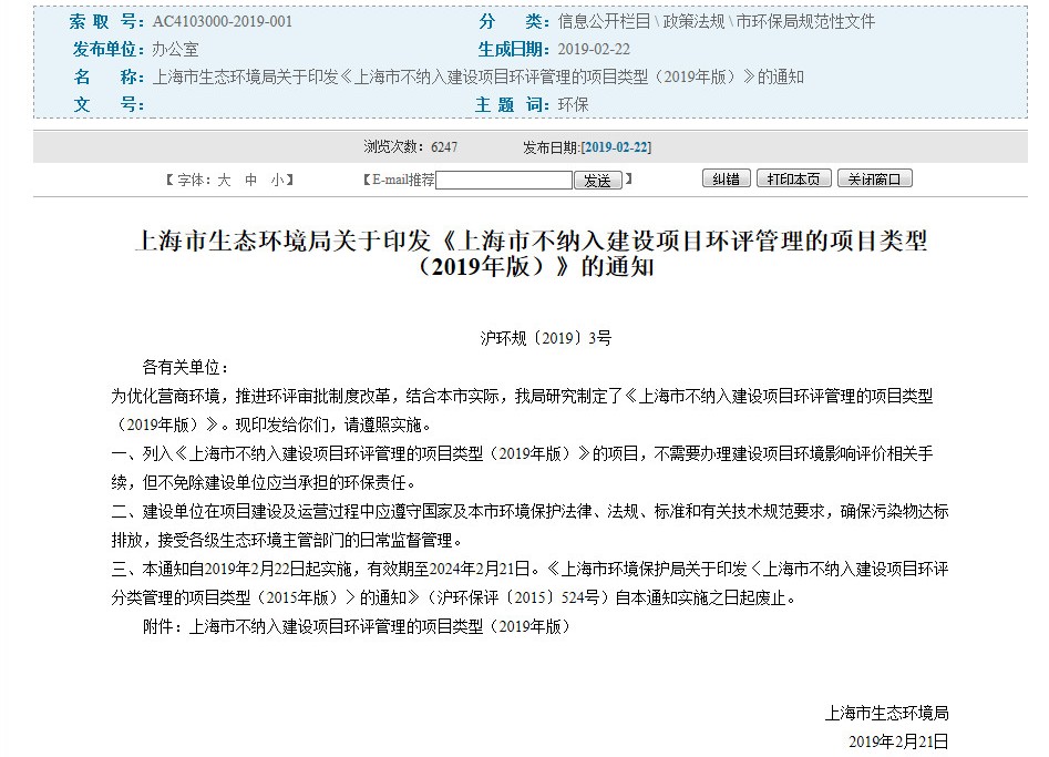 文章導讀“全市超過1/4的建設(shè)項目將不需要辦理環(huán)評手續(xù)了。”記者近日從上海市生態(tài)環(huán)境局了解到,最新出臺的《上海市不納入建設(shè)項目環(huán)評管理的項目類型(2019年版)》以正面清單方式,明確了上海市范圍內(nèi)不納入建設(shè)項目環(huán)評管理的項目類型。來源:中國環(huán)境報 據(jù)上海市生態(tài)環(huán)境局介紹,《豁免名錄》實施后,上海超過...