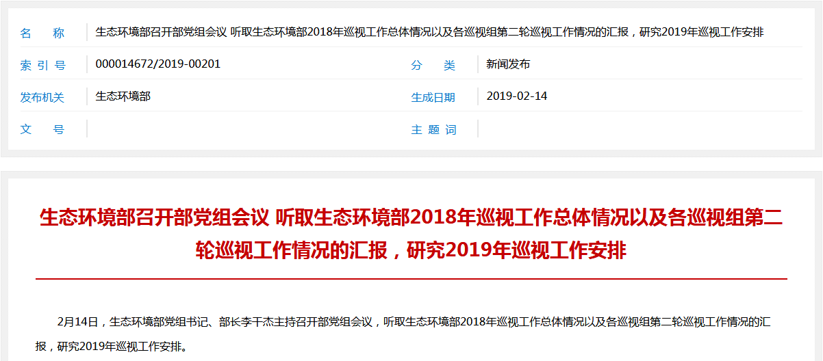 2月14日,生態(tài)環(huán)境部黨組書記、部長李干杰主持召開部黨組會議,聽取生態(tài)環(huán)境部2018年巡視工作總體情況以及各巡視組第二輪巡視工作情況的匯報(bào),研究2019年巡視工作安排。會議指出,巡視工作是落實(shí)全面從嚴(yán)治黨主體責(zé)任、加強(qiáng)領(lǐng)導(dǎo)班子和干部隊(duì)伍建設(shè)的重要抓手。黨的十九大以來,生態(tài)環(huán)境部黨組研究制定巡視工作五...