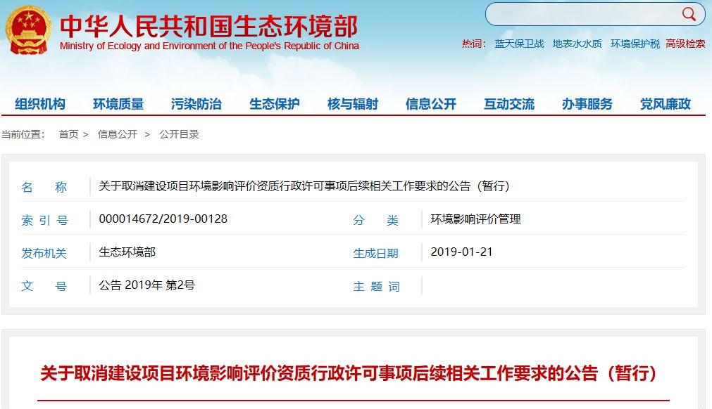 關(guān)于取消建設(shè)項(xiàng)目環(huán)境影響評(píng)價(jià)資質(zhì)行政許可事項(xiàng)后續(xù)相關(guān)工作要求的公告(暫行) 《全國人民代表大會(huì)常務(wù)委員會(huì)關(guān)于修改〈中華人民共和國勞動(dòng)法〉等七部法律的決定》(中華人民共和國主席令第二十四號(hào))已于2018年12月29日公布施行,對(duì)《中華人民共和國環(huán)境影響評(píng)價(jià)法》作出修改,取消了建設(shè)項(xiàng)目環(huán)境影響評(píng)價(jià)資質(zhì)行...