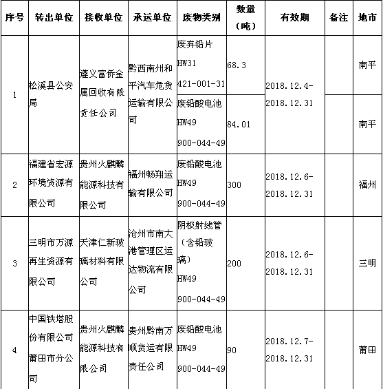 中國環(huán)聯(lián)網(wǎng)獲悉,日前福建省環(huán)境保護廳發(fā)布了《2018年12月福建省危險廢物跨省轉(zhuǎn)移情況公告》,共有24項,具體內(nèi)容如下: