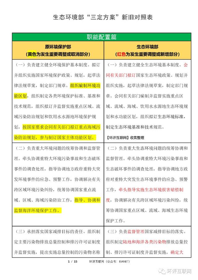近日,生態(tài)環(huán)境部“三定方案”已經(jīng)印發(fā),在重新整合了部門的職責(zé)之外,還增設(shè)了新的職能及崗位。為方便大家更好地理解生態(tài)環(huán)境部前后職能配置、內(nèi)設(shè)機(jī)構(gòu)和人員編制的變化,環(huán)環(huán)整理編輯發(fā)布新舊“三定方案”對照表,以供參考。特別說明:生態(tài)環(huán)境部“三定方案”以官網(wǎng)最終發(fā)布版本為準(zhǔn)。01職能變化1. 新增“中央生態(tài)環(huán)...