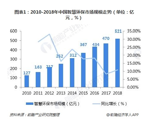在“十三五”的環(huán)保政策熱潮以及ICT技術(shù)成熟背景下,我國智慧環(huán)保行業(yè)發(fā)展迅速,據(jù)測算,2018年行業(yè)規(guī)模為521億元,同比增長10.91%,2010-2018年行業(yè)復(fù)合增速達(dá)到19.31%。 一、市場規(guī)模:政策熱潮和技術(shù)發(fā)展雙催動(dòng),智慧環(huán)保市場增長空間大 “十三五...