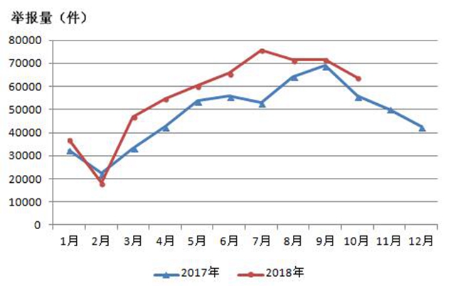 2018年10月,全國環(huán)保舉報(bào)管理平臺共接到環(huán)保舉報(bào)63883件,已受理54305件。其中,“12369”環(huán)保舉報(bào)熱線電話共31354件,微信舉報(bào)25831件,網(wǎng)上舉報(bào)6698件。從污染類型來看,10月大氣污染、噪聲污染舉報(bào)較多。 一、秋冬季舉報(bào)出現(xiàn)下降趨勢 2018年10月...