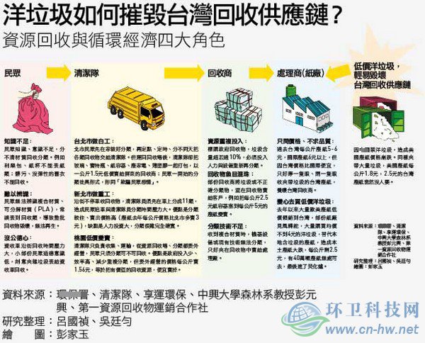 2016年,《華爾街日報(bào)》在一篇報(bào)導(dǎo)里,盛贊臺灣是垃圾處理的天才,因?yàn)閸u內(nèi)資源回收率為58%(其實(shí)是52.51%),傲視全球,也吸引了世界各地環(huán)保專家前來考察。2017年7月,大陸國務(wù)院公布《禁止洋垃圾入境推進(jìn)固體廢物進(jìn)口管理制度改革實(shí)施方案》,禁止夾帶一般垃圾的廢塑料、廢紙等進(jìn)口,除非最低垃圾含量...