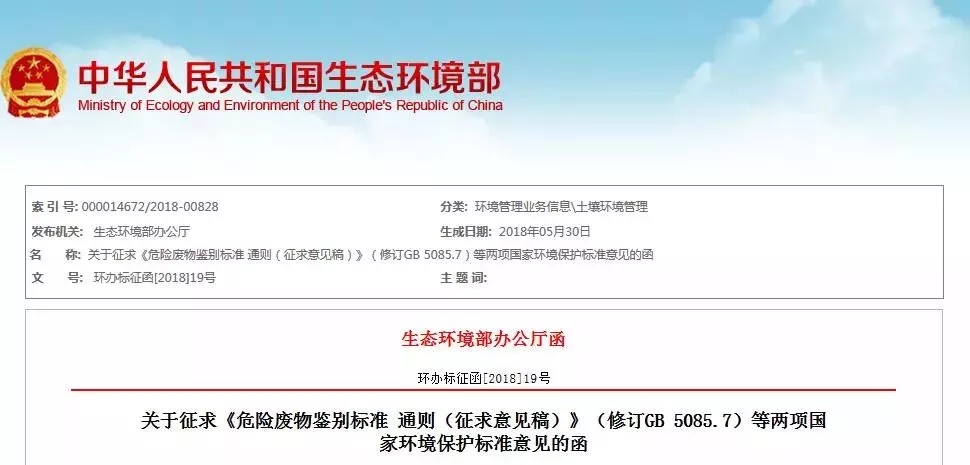 為貫徹《中華人民共和國環(huán)境保護法》《中華人民共和國固體廢物污染環(huán)境防治法》,防治危險廢物造成的環(huán)境污染,加強對危險廢物的管理,保護環(huán)境,保障公眾健康,生態(tài)環(huán)境部修訂形成了國家環(huán)境保護標準《危險廢物鑒別標準 通則(征求意見稿)》(GB 5085.7)、《危險廢物鑒別技術規(guī)范(征求意見稿)》(HJ/T ...