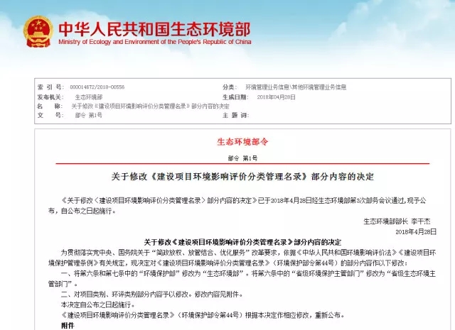 生態(tài)環(huán)境部2018年第3次部務(wù)會(huì)審議并通過(guò)了《關(guān)于修改<建設(shè)項(xiàng)目環(huán)境影響評(píng)價(jià)分類(lèi)管理名錄>部分內(nèi)容的決定》,對(duì)《建設(shè)項(xiàng)目環(huán)境影響評(píng)價(jià)分類(lèi)管理名錄》(環(huán)境保護(hù)部令第44號(hào))的部分內(nèi)容予以修改,并于公布之日起實(shí)施。來(lái)源:生態(tài)環(huán)境部修改《建設(shè)項(xiàng)目環(huán)境影響評(píng)價(jià)分類(lèi)管理名錄》,是落實(shí)習(xí)近平總書(shū)記重...