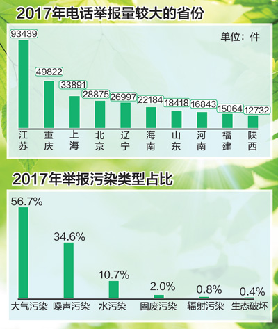 環(huán)境保護部1月23日發(fā)布通報:2017年,全國環(huán)保舉報管理平臺共接到環(huán)保舉報61.89萬件,其中“12369”環(huán)保舉報熱線電話41萬件,約占66.2%,微信舉報近13萬件,約占20.9%,網(wǎng)上舉報79885件,約占12.9%。目前已辦結(jié)近59萬件,其余2.9萬件正在辦理中,環(huán)保舉報辦結(jié)率達95%。電...